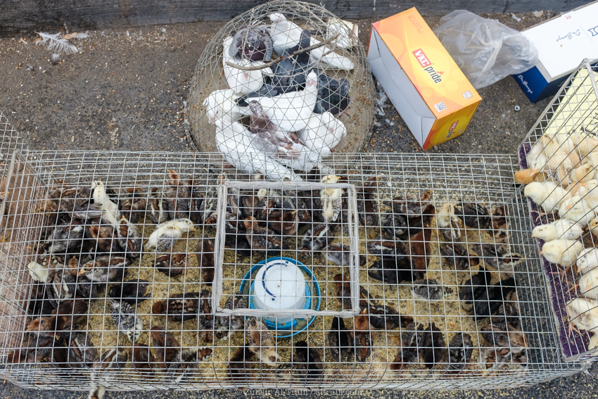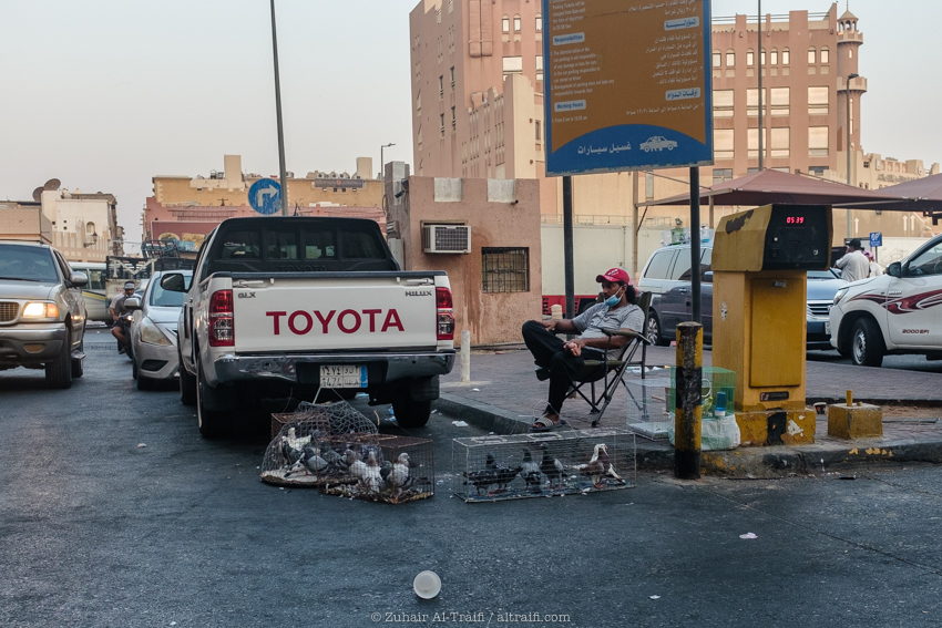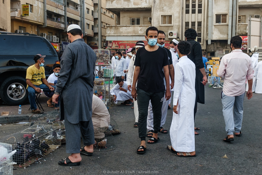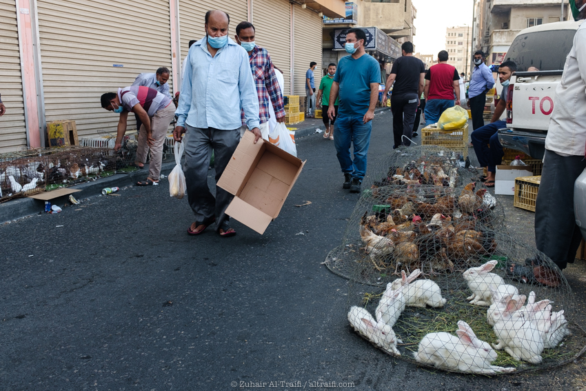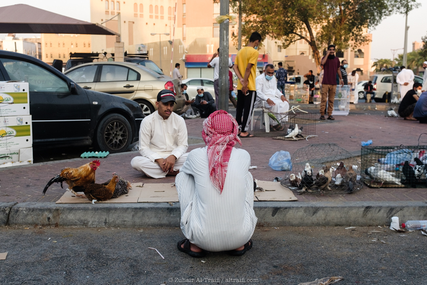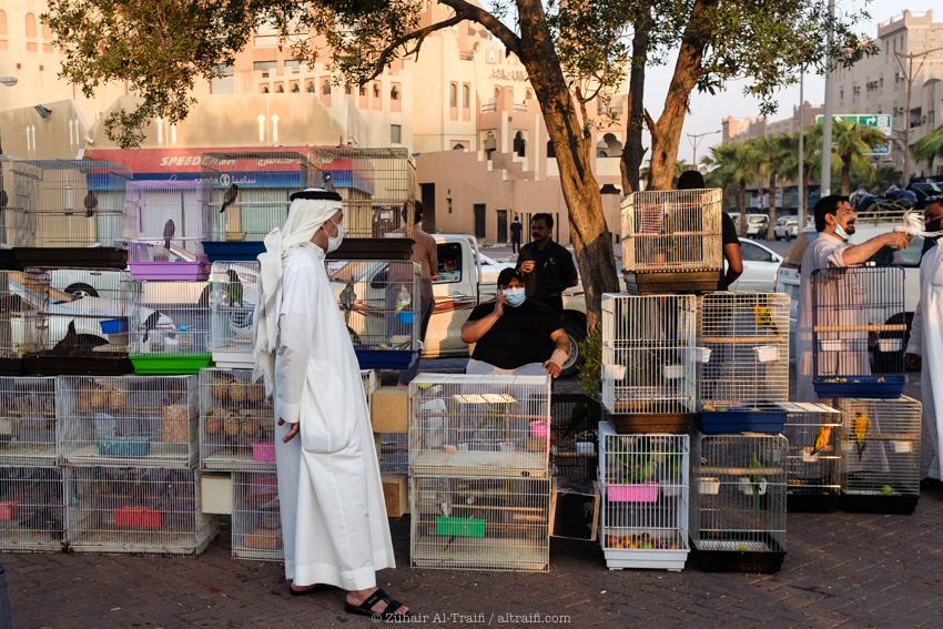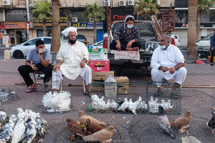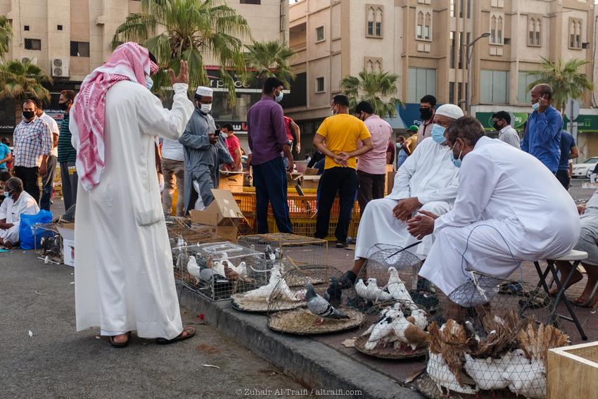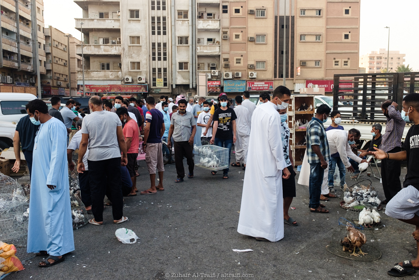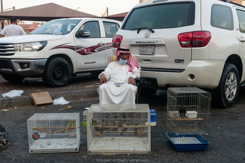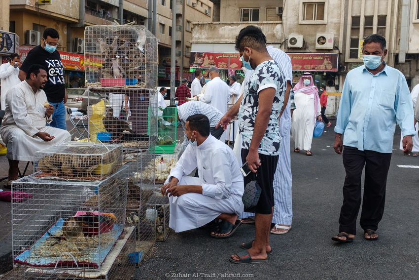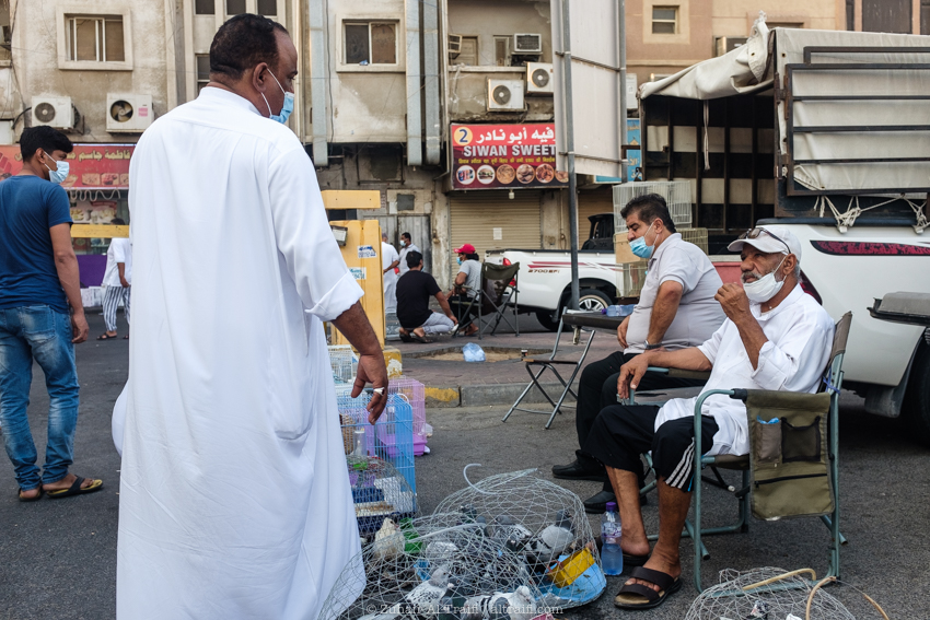 تدوينة اليوم من سوق الطيور في الدمام وهو سوق أسبوعي يقام كل يوم جمعة، قمت سابقاً بتصوير ونشر عن هذا السوق في المشروع (اليوم ٥٣ – الدمام) السوق يبدأ قبل شروق الشمس في الصباح الباكر ويصبح أكثر إزدحاماً بعد ساعات قليلة ويستمر حتى وقت صلاة الجمعة، السوق يستخدم مساحة مواقف سيارات للجزء الرئيسي من السوق والمخصص غالباً للطيور وبجانبه ممرات الشوارع الضيقة والتي يستخدمها البائعون في بيع مختلف الأشياء. بسبب جائحة الكورونا كل شيء توقف لشهور والان أصحاب السوق سعيدين بعودته ببطء وبالطبع بحذر.