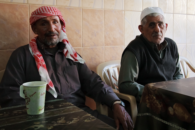 Two Yemeni old men siting in a small restaurant, drinking tea and chatting about their life