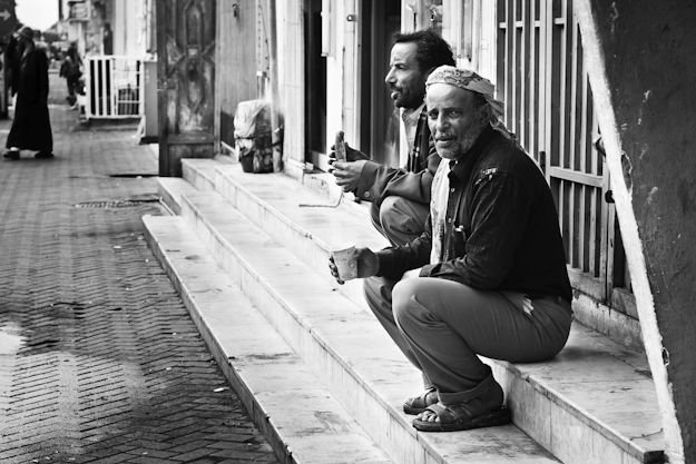 Some Yemenis workers eating their breakfast on the sideway