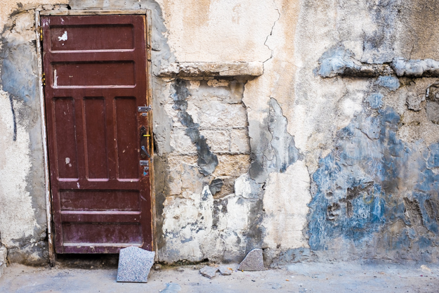 باب خشبي قديم على جدار قديم ويكاد أن يسقط هذا الجدار