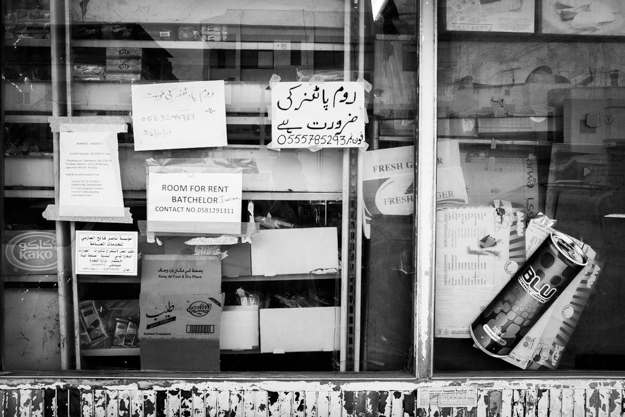 بعض الإعلانات على بقالة صغيرة، لاحظ اللغات المختلفة !