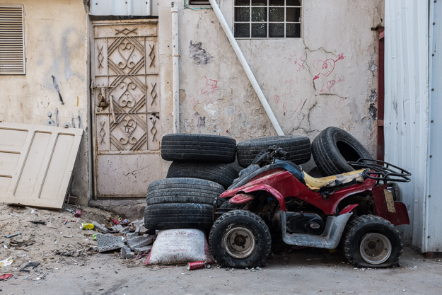 دراجة نارية ذو أربعة عجلات بجانب أحد البيوت ويبدو أنها لم تتحرك منذو فترة ليست بالقصيرة