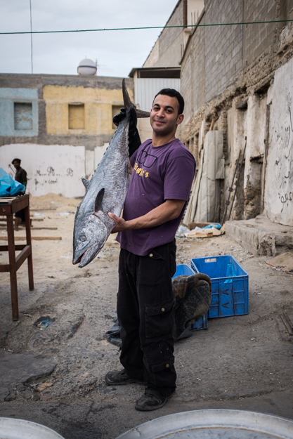 أحد أبناء الحي يستعرض أحد أنواع السمك الذي يقوم ببيعه وهو معروف هنا جيداً