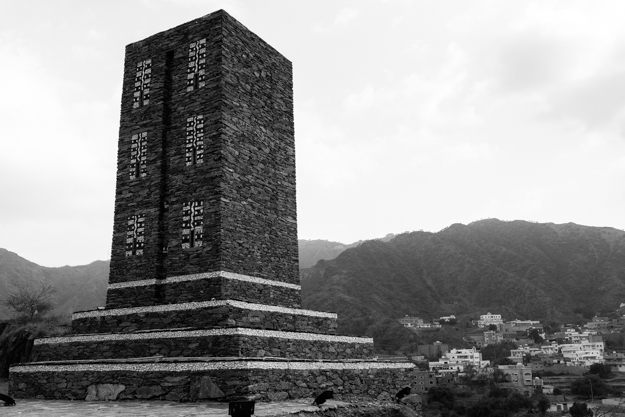 وصلت إلى محافظة رجال ألمع واستقبلني هذا النصب التذكاري التاريخي والذي يمثل المحافظة بلون حجارته الغامقة