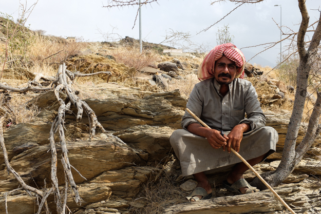 لم أقم بالتوقف أبداُ في جبل السودة، في الحقيقة لم يكن هناك المجال لعمل ذلك حتى أصبحت قريباً من أبها توقفت لأقوم بتشييك شيئاً ما بالسيارة ورأيت هذا الرجل المسن، توجهت مباشرة له وبيدي الكاميرا لكي ألتقط هذه الصورة ولقد سعيداً لذلك !
