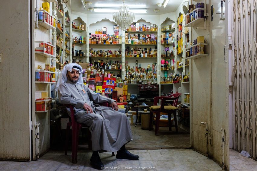 في أعماق السوق (ليست مبالغة) وجدت هذا الرجل مع محله الصغير، أبو مالك يعمل في مجال الطيب والعود لأكثر من ٣٠ سنة، بدأ العمل في سن مبكرة مع والده في مجال العطارة والأعشاب وبعد ذلك أصبح مستقلاً عن والده وغير مجاله إلى بيع الطيب والعود، يذكر أنه في هذا المحل نفسه من أكثر من ١٠ سنوات