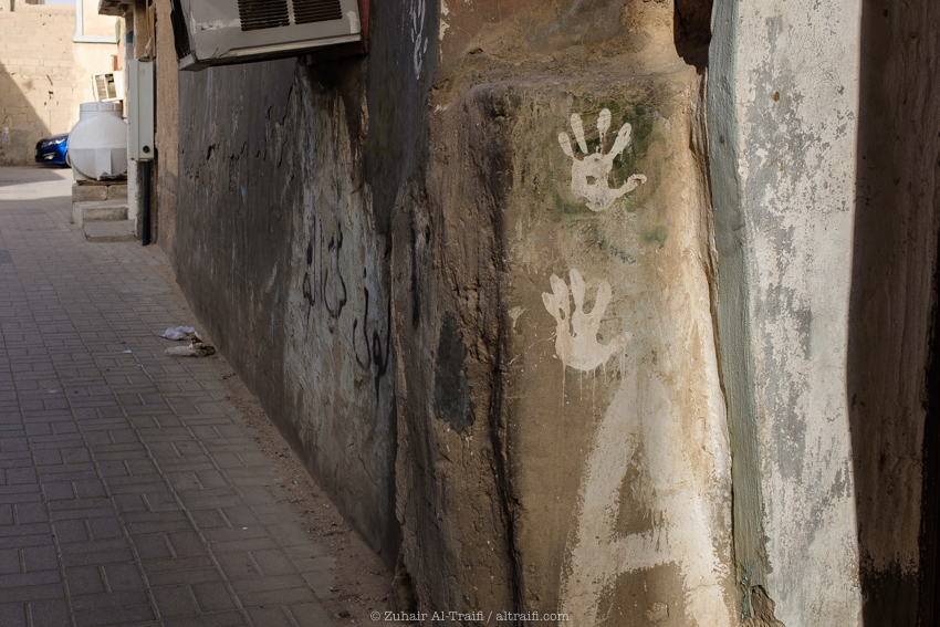 طبعات أيادي على الجدران، رأيت مثل هذا المشهد كثيراً في مختلف الأحياء في جولات سابقة