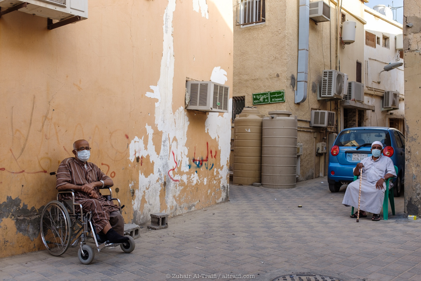 اثنين من كبار سن الحي اعتادوا على الجلوس خارجاً في فترة المساء، وفي ذلك الوقت لا يزال الناس بشكل صارم يتبعون اجراءات التباعد بسبب فايروس كورونا، ولهذا السبب كان يجلسون متباعدين عن بعضهم البعض وبالإضافة إلى ذلك لم يرغبوا في إزالة الماسك من أجل هذه الصورة