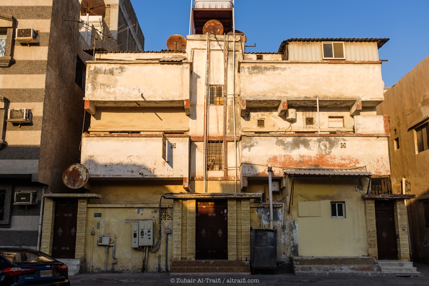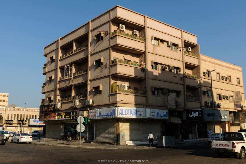 العمارات السكنية والتي يعود بعضها من ٣٠ حتى ٥٠ سنة، بعض العمارات تحتوي على محلات تجارية جزء من السوق الموجود على الشارع