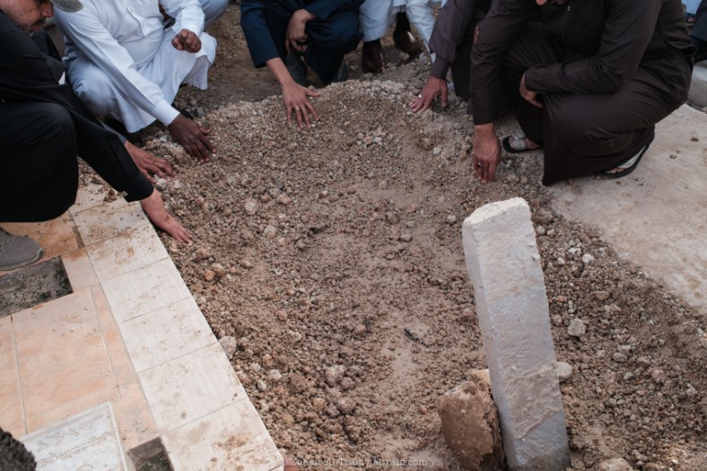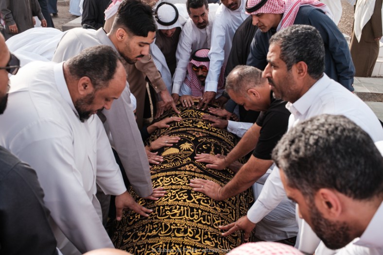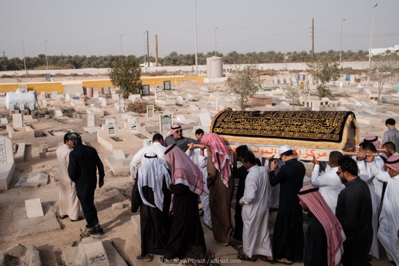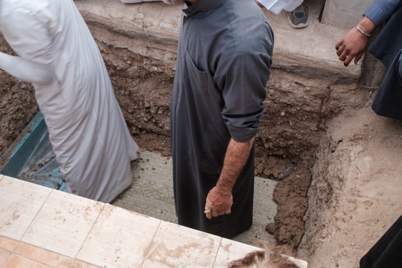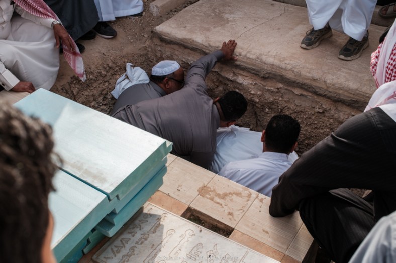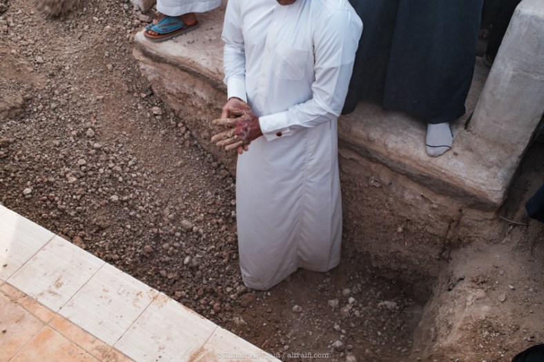 وثائقي عن الدفن في السعودية وبالتحديد في أحد قرى محافظة الأحساء، قمت سابقاً بنشر تدوينتين لنفس الموضوع وسأقوم بوضع الروابط الخاصة بها في نهاية هذه التدوينة. الصور لمراسم الدفن هذه بدأت عند وصول المتوفى إلى المقبرة، الناس الموجودة تشارك في حمل المتوفى في حامل خاص مغطى بقطعة قماش مليئة بأسماء الله وآيات من القرآن الكريم، أثناء الحمل يتم التوقف عدة مرات منها لأداء صلاة الميت وأيضاً لقراءة سورة الفاتحة على المتوفى قبل الوصول إلى القبر، بعد ذلك يتم انزال المتوفى في حفرة القبر بعناية ويتم إغلاقها بطبقات من الألواح والطين قبل أن تتم عملية الدفن المعروفة بالرمال حتى يتم مساواتها مع الأرض